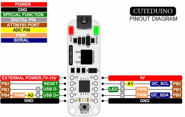 Well, we have modify the DigiSpark with breadboard friendly pin layout, higher current voltage regulator and on board Micro-B USB receptor. Most of Android phone uses Micro-B USB cable so you can utilize it. Of course CuteDuino is Arduino compatible, take it as 5 I/O (2 shared with USB) Arduino main board. There are several tutorials ready for you. not to forget the User's Manual.