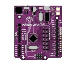 Maker UNO is fully compatible with Arduino. You can share the same library and code. We put in 12x LEDs, 1x piezo buzzer and 1x programmable button on the Maker UNO. We have removed the DC jack power input socket as most of the boards used in classes are powered using USB. We have also replaced the ATmega16u2 with CH340 to bring down the cost.