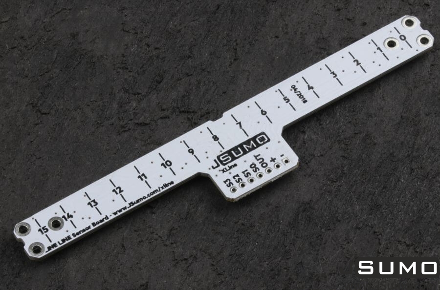 Specially designed line sensor for more broad line coverage. Each sensor is placed with 7mm apart.Technical SpecsWorks at 5V, total current draw is 240ma for all 16 sensors.Total weight is 6 grams.XLine board's dimension is 117.8mm L x 23mm W x 3.8mm H.Sensors selected with analog multiplexer. You need to attach 4 digital outputs and 1 analog input. So Xline will use total 5 I/O only except of 16!Here the test code for easy to use.//JSumo.com